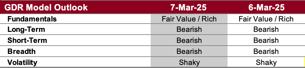 Breadth Outlook (as of 6 Mar 2025): breadth has closed bearish multiple days in a row. The model’s components are in line with an overall bearish outlook.