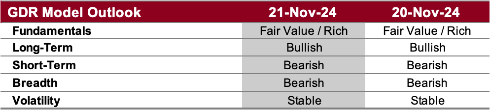 The GDR Model is flat as it has continued to pick up on near-term weakness in the market.