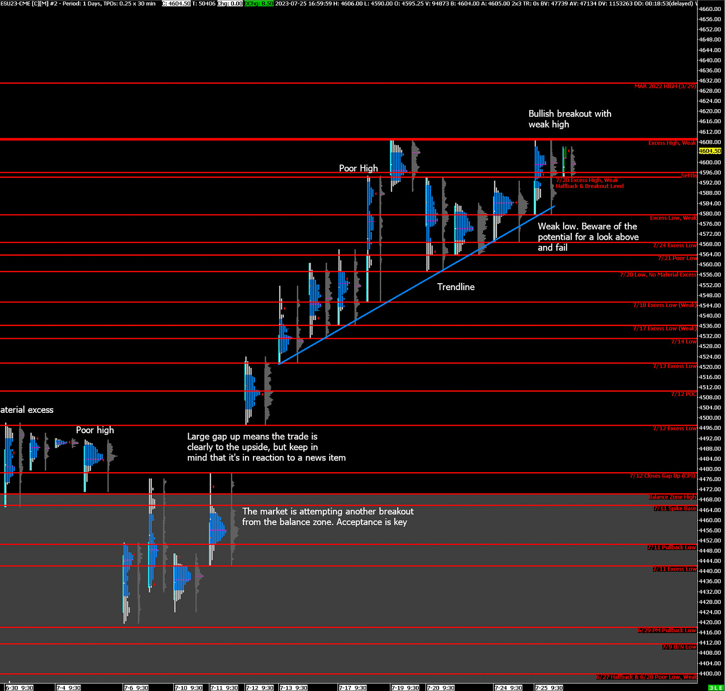 Bearish: 4594 (Top of Short-Term Balance / Breakout Level), 4579 (Excess Low, Weak Low), 4564 (7/21 Poor Low)