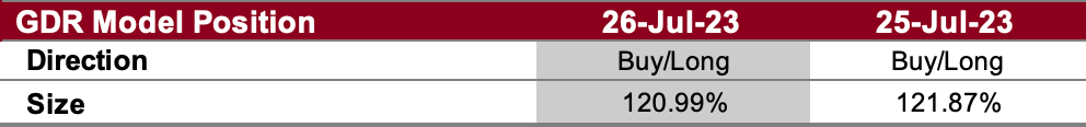 After a short break, the GDR Model is back to its long position as its outlook remains bullish across the board. This is a fairly bold position given all the critical data releases coming this week.