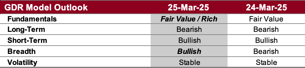 Breadth Outlook (as of 22 Mar 2025): breadth is upgraded all the way to bullish. For now the impact on the overall read of the model remains minimal, but it sure adds on to all the other more bullish reads within the model’s components.