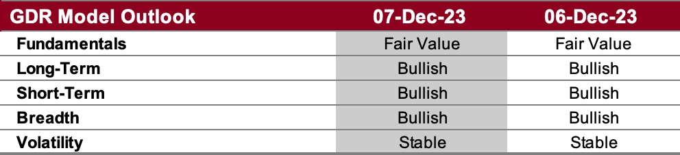 In light of underlying market strength, the GDR Model has a meaningful long position.
