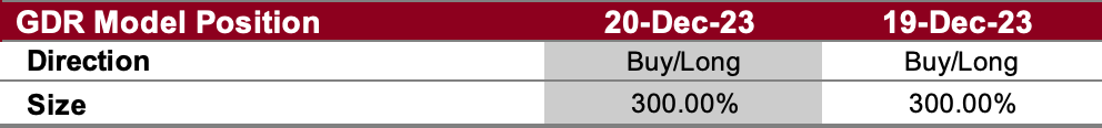 In light of underlying market strength, the GDR Model has a meaningful long position.