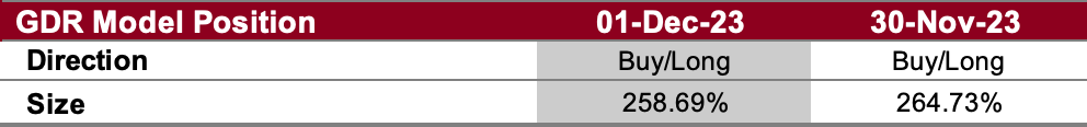 In light of recent underlying market strength, the GDR Model has a meaningful long position.