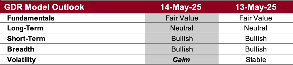 Breadth Outlook (as of 13 May 2025): Bullish. The model is pretty much bullish across the board, so the bullish breadth reinforces it.