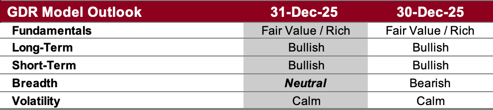 Breadth Outlook (as of 30 Dec 2025): Neutral. Breadth has improved back up to neutral. The recent back and forth here corroborates the indecision the model is picking up on in the short-term.