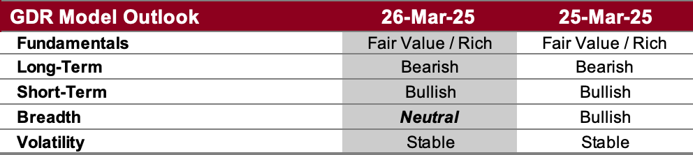 Breadth Outlook (as of 25 Mar 2025): breadth is back down to neutral. For now the impact on the overall read of the model remains minimal.