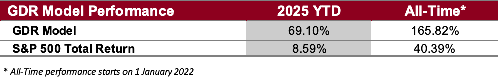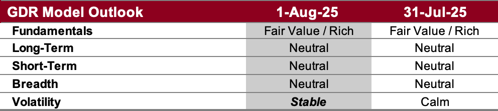 Fundamentals Outlook (as of 26 Jun 2025): Fair Value/Rich. The model has adjusted valuations slightly downward following the release of new data. Going forward GDR Model positioning should tactically tilt a little less towards the long side, all else equal. Note that this is just a barometer to help guide longer-term decision-making rather than short-term market timing.