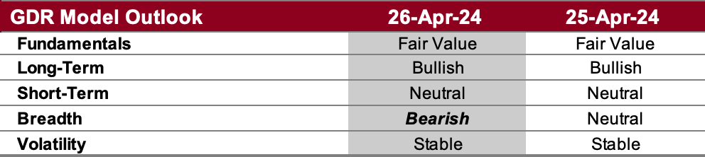 The GDR Model is neutral to bullish, but the market may be in a transition period… Time will tell whether the recent weakness is transitory or persist for longer.