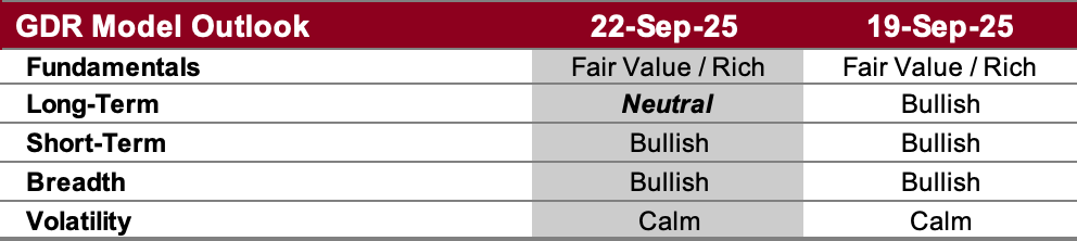Overall Outlook (as of 19 Sep 2025): BULLISH TO NEUTRAL. After picking up on increasing strength over the recent days, the GDR Model has detected fresh weakness in the market to close the week. Either some sustained strength comes into the market to support it or the odds of the current rally continuing much further are likely low.