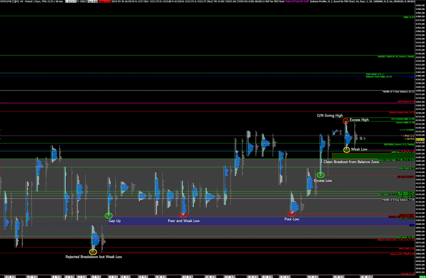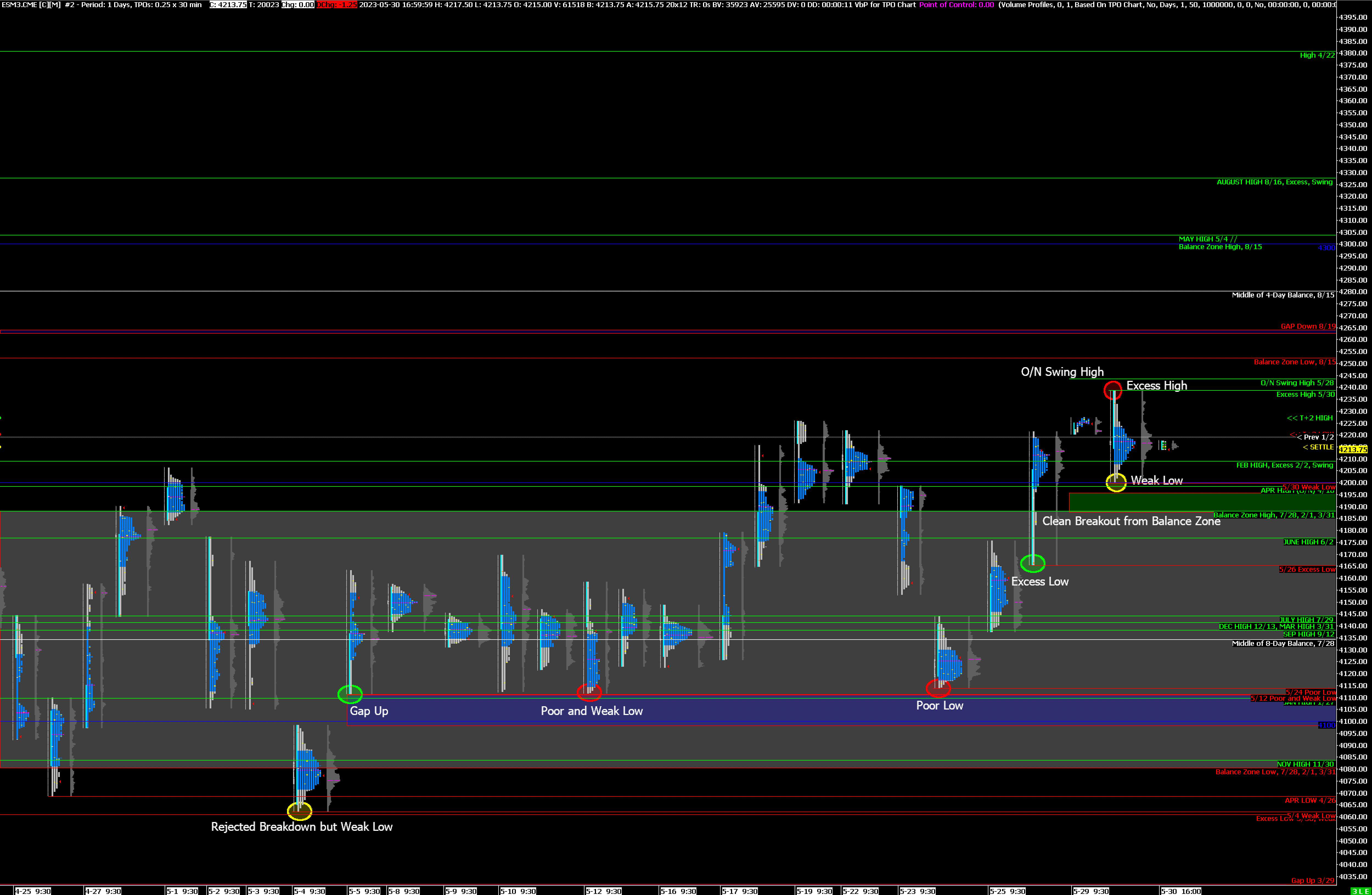 Bearish: 4200 (Weak Low), 4188 (Top of Lower Balance Zone, Closes Double Distribution), 4165 (Prev Low)