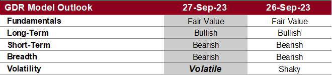 The GDR Model is now neutral to bearish as the market has weakened throughout the last two weeks. Time will tell whether that weakness will be sustained and leads to a more serious sell-off.