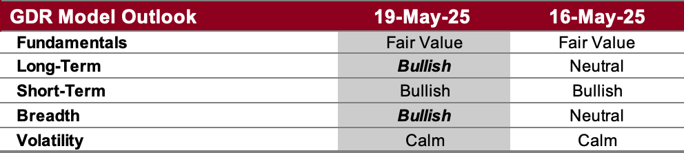 Breadth Outlook (as of 16 May 2025): Bullish. Back in line with the rest of the model. This reinforces the current strength in the market.