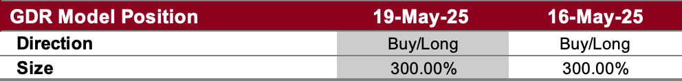 The GDR Model is carrying a significant long position. As the market remains strong and volatility suppressed, the GDR Model continues to see increased odds of further upside.