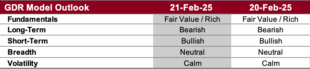 Short-Term Outlook (as of 20 Feb 2025): the short-term outlook remains bullish, but had an overall weak day. If there is a meaningful longer-term sell-off coming, the short-term outlook will inevitably weaken, even if with a delay.