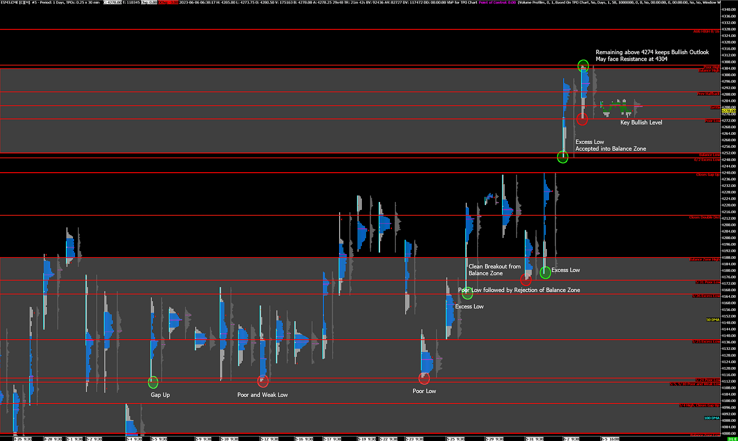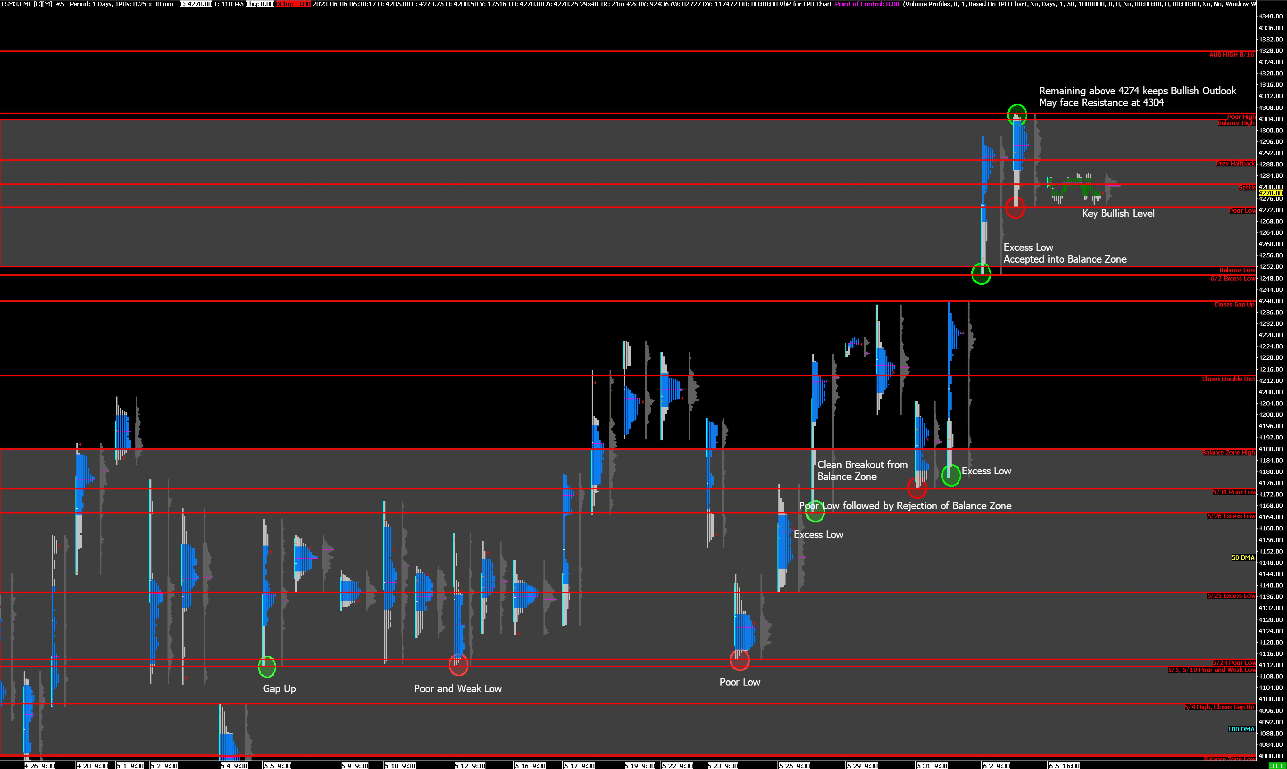 Bearish: 4273 (Poor Low), 4252 (Bottom of Current Balance Zone), 4240 (Closes Gap Up)