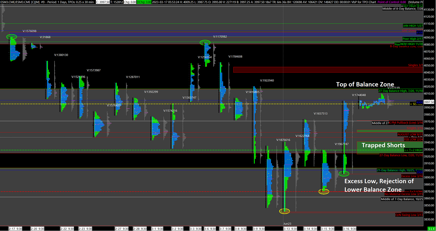 Yesterday’s trading was an emphatic rejection of the Lower Balance Zone leaving behind an Excess Low. The market then traded markedly higher, but given the two Poor Highs from 3/14 and 3/15 that it repaired in the process, there are good chances that short-term Inventories got too short and yesterday was just a short-covering rally. Today it will likely be important to remain aware of the potential for failure near the top of the current Balance Zone.