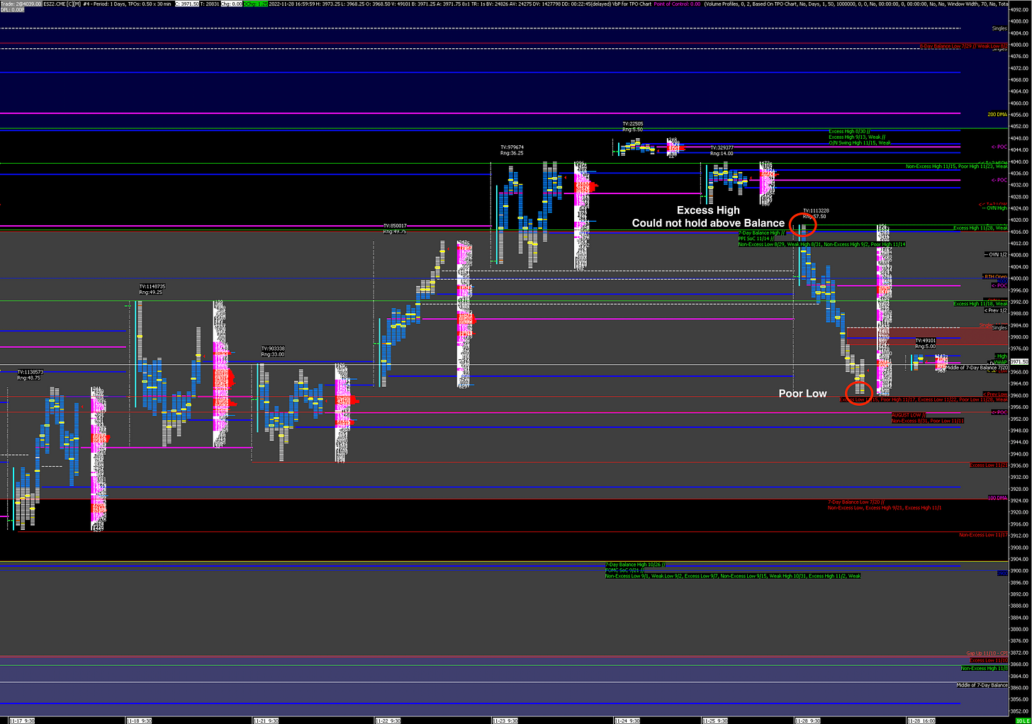 While market structure clearly points near-term Bearish, there are some Bullish markers; the most recent Swing High was made in the overnight session, today’s High is Weak as it coincides with the High of the Balance Zone and the poor structure left behind on the 11/22 trend day up has been repaired. Despite all this, the market seems set to at least taking a short breather from further upside.