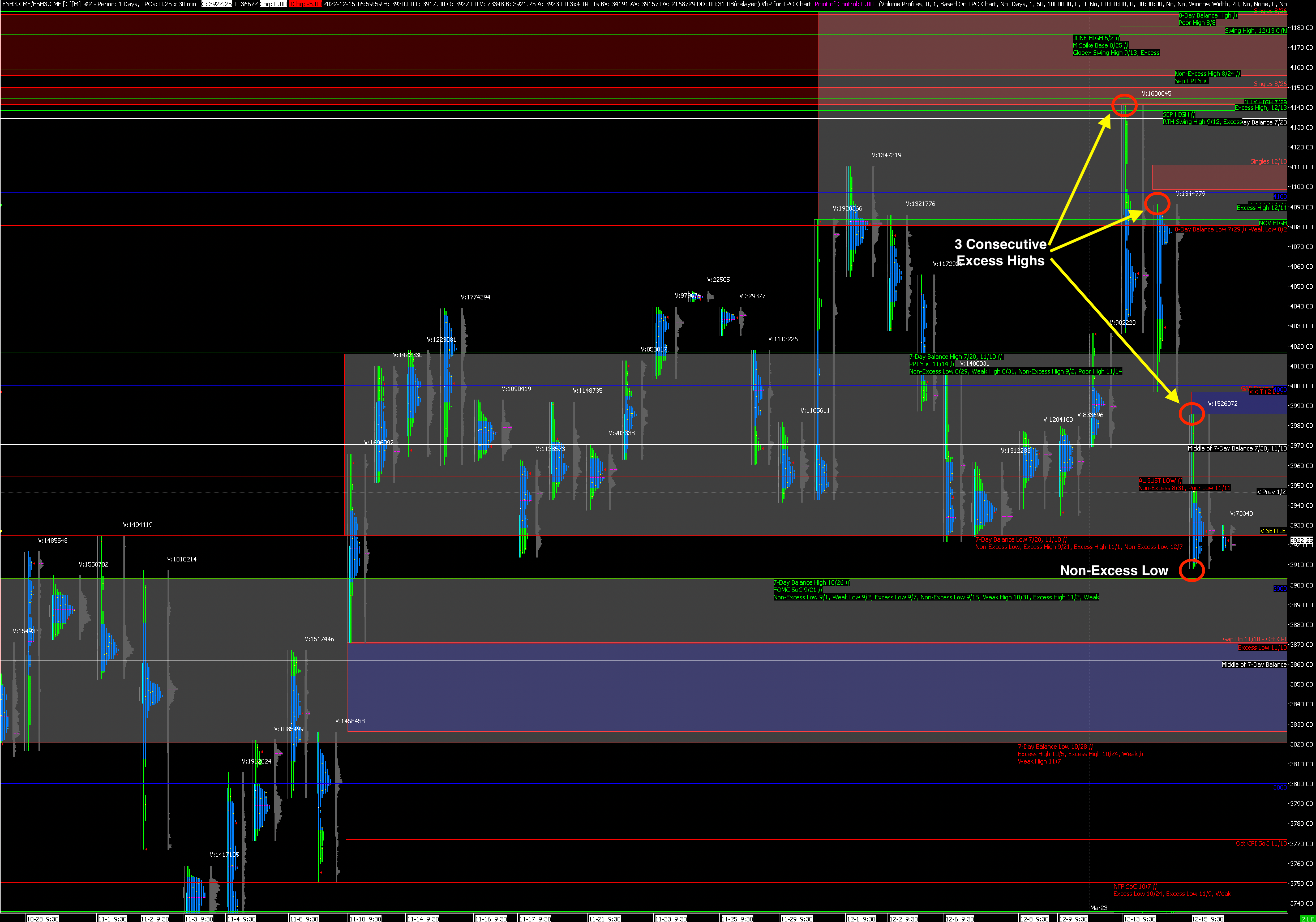 While yesterday Market Profile was relatively more Bullish than Bearish, today makes it clear that the odds of further downside in the near-term are very high. This became clear when the market opened on a Gap lower that failed to fill. There are now 3 consecutive Excess Highs, and today’s low barely has any Excess.