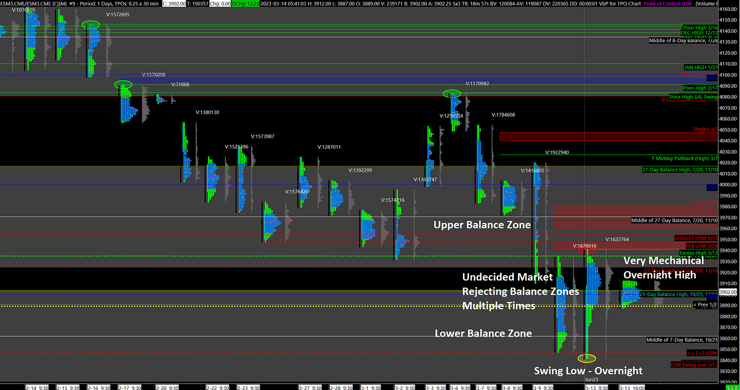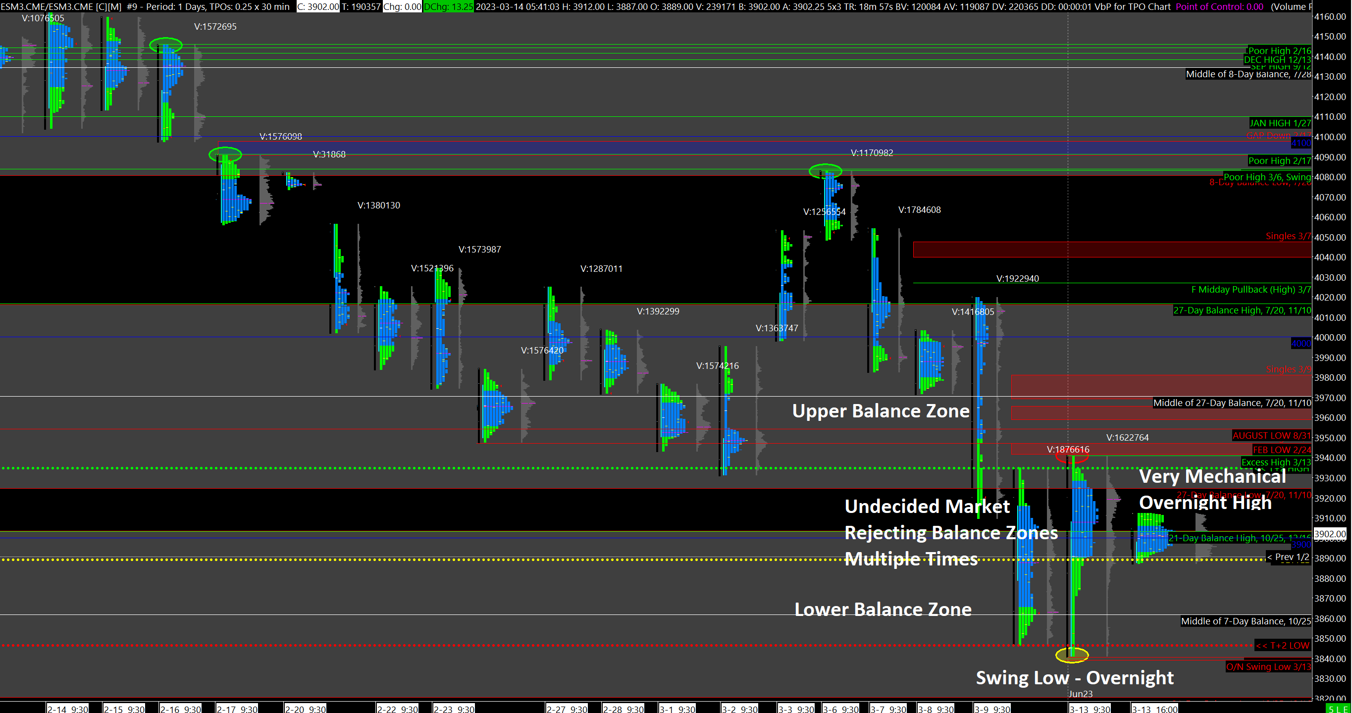 The key take away from yesterday’s trading is that the market is currently undecided as the ES rejected both the Upper and Lower Balance Zones multiple times over the course of the day, leaving Excess on both the High and the Low. Treat today as Short-Term Balance with edges on yesterday’s High and Low.
