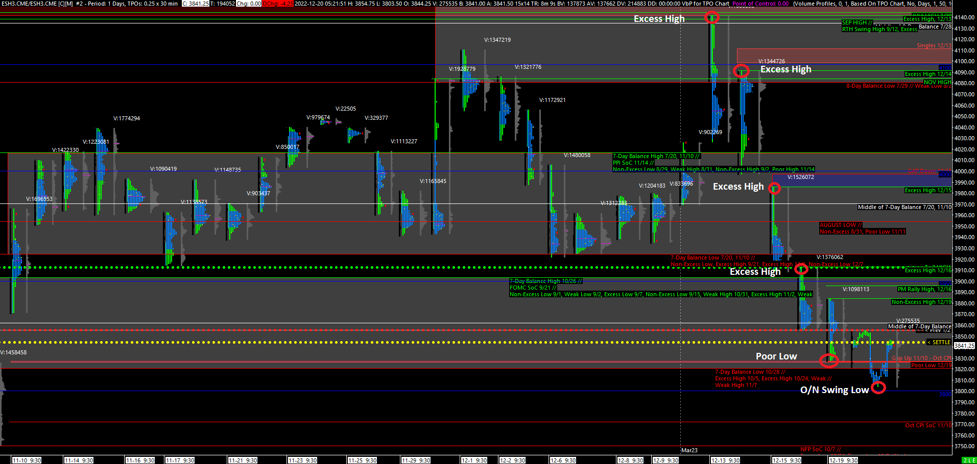 The market stopped just short of closing the Gap Up from 11/10 (i.e. from the CPI release last month) and left behind a Poor Low in need of repair. In addition, the overnight session has put in a Swing Low. These don’t tend to last long without being revisited in the regular US trading session.