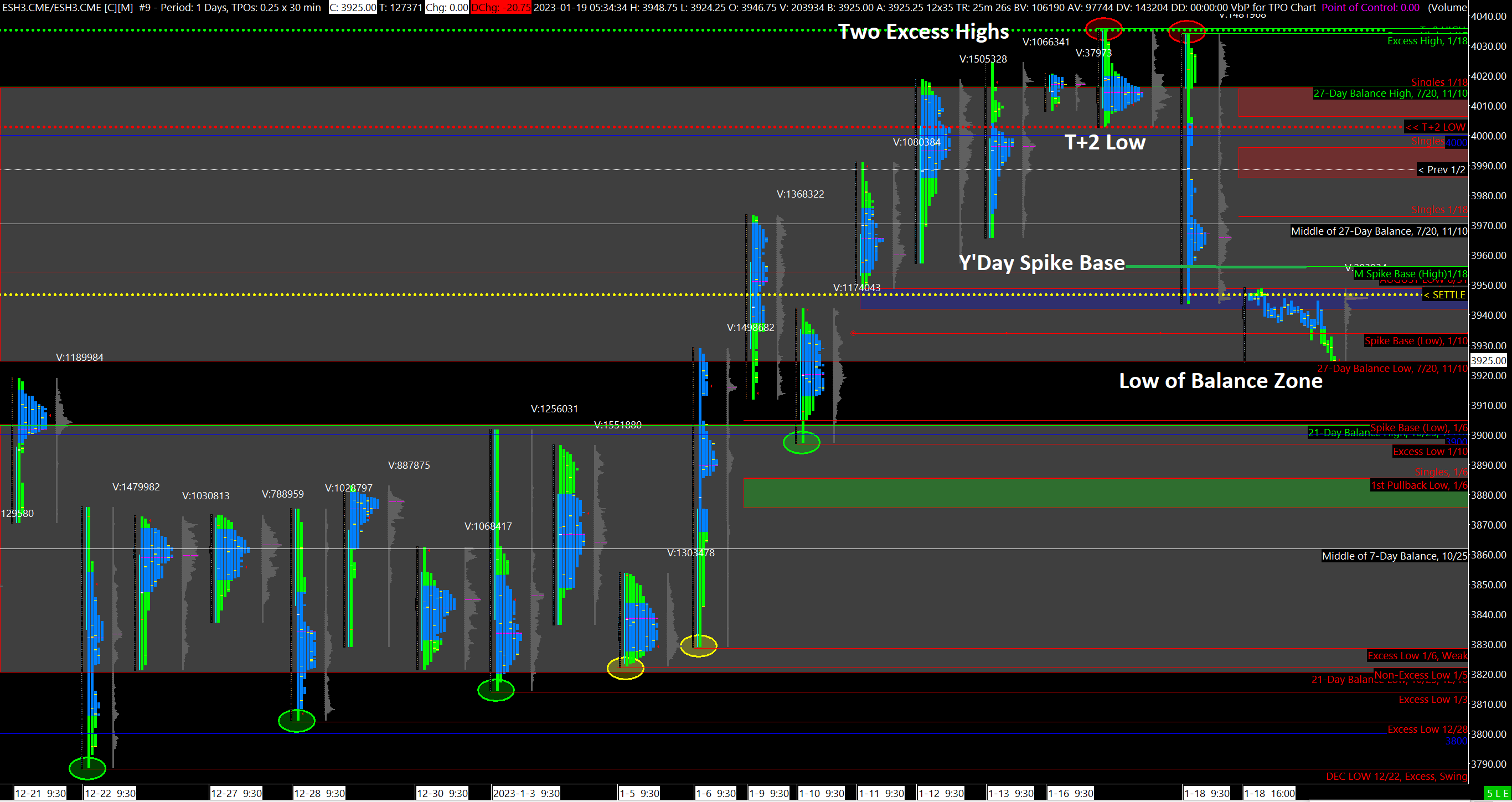 Bearish: 2 consecutive Excess Highs, ES trading well below T+2 (Settlement) Low, potential for break down below current Balance Zone and into lower Balance Zone