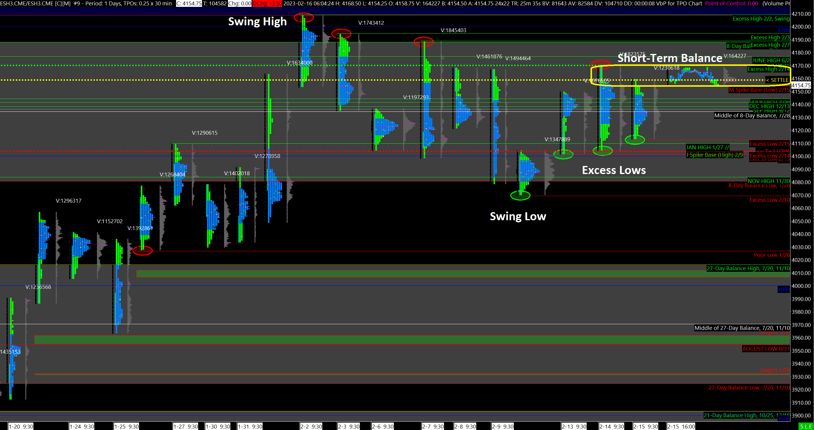 The market trading relatively close to the middle of the current Balance Zone, and yesterday was an Inside Day, meaning yesterday’s range is entirely within the previous day’s (T+2) range. Going into today, the short-term Bullish outlook is maintained if the ES does not trade and accept below yesterday’s Spike Base at 4154. Moreover, taking out the prominent 4 prominent Excess Highs would likely get the next leg higher going.