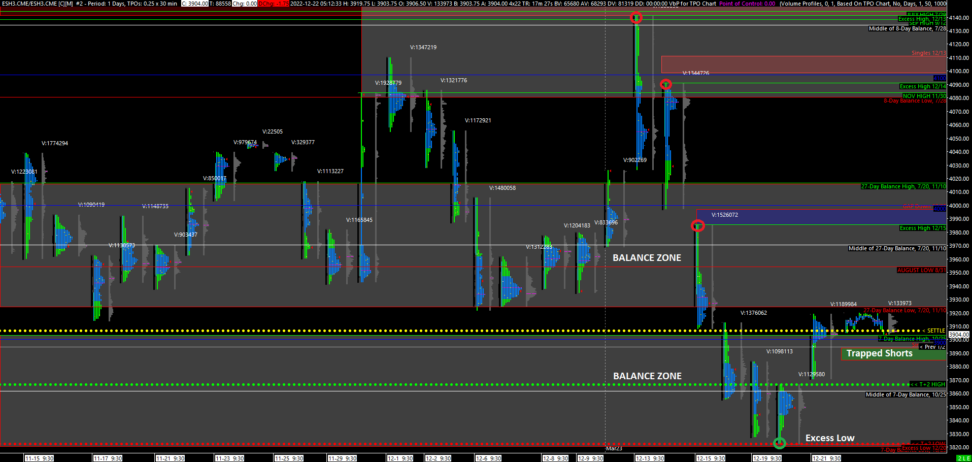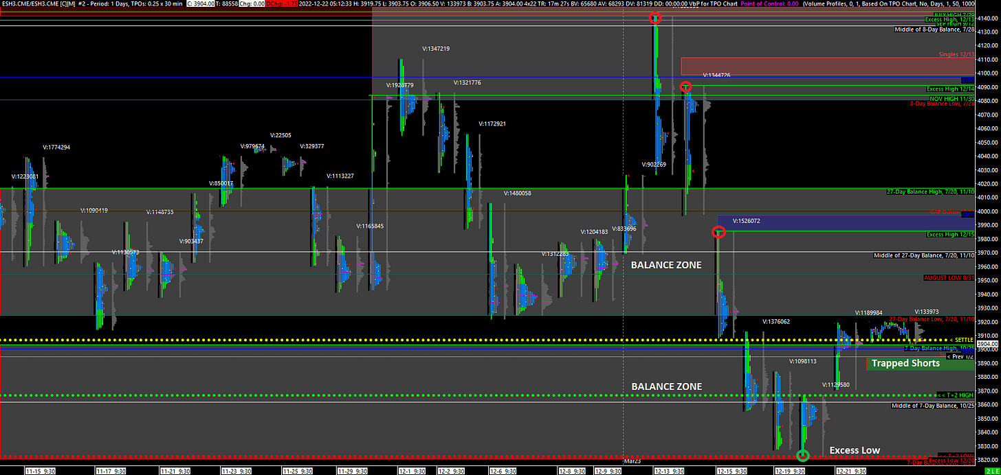 Yesterday’s Market Profile suggests there was more short-covering, this time with poor structure and no follow-through. In addition, the market closed just above the most recent Balance Zone so there is potential for a return to it. This materially raises the odds of downside today relative to yesterday.