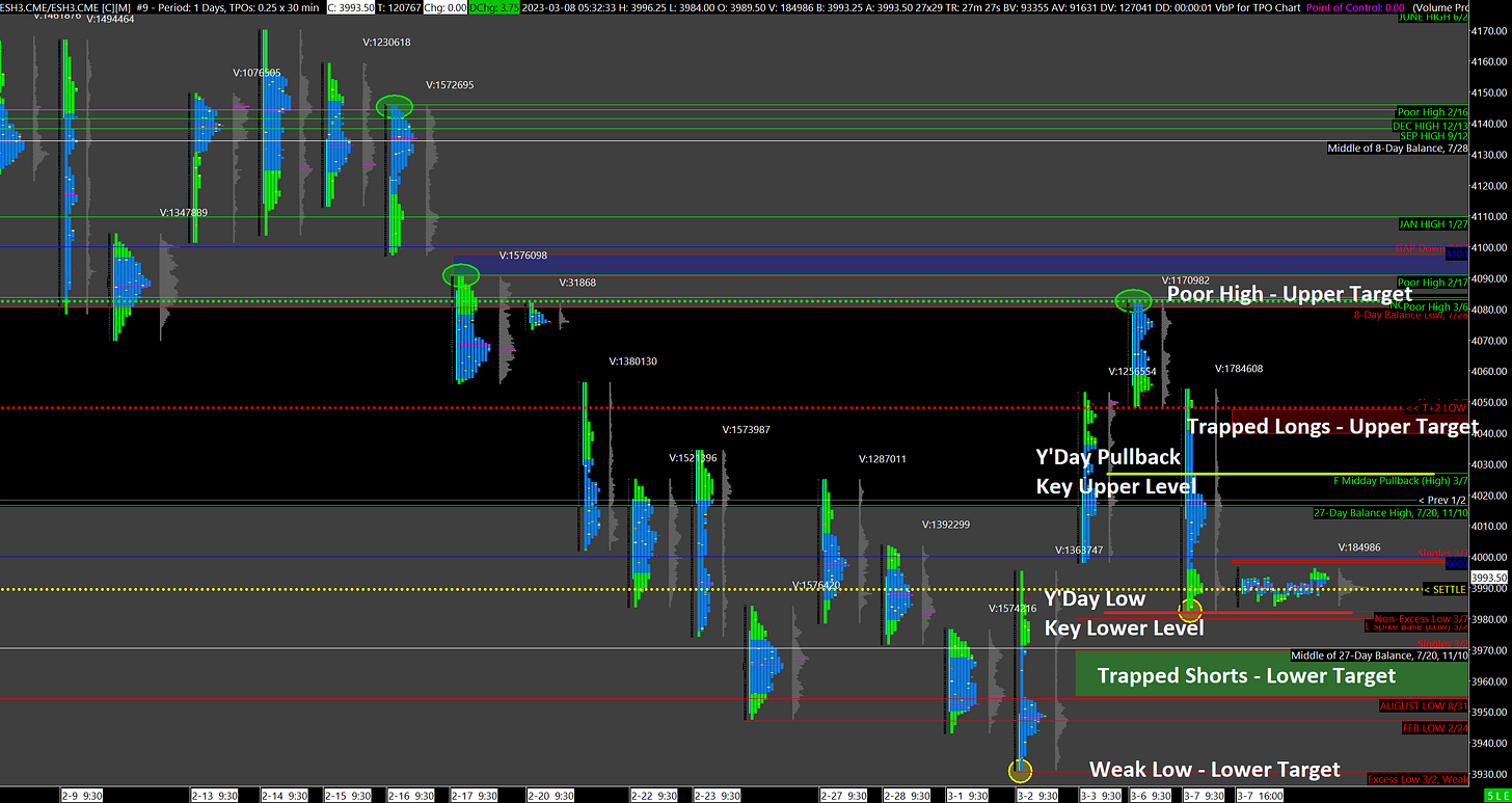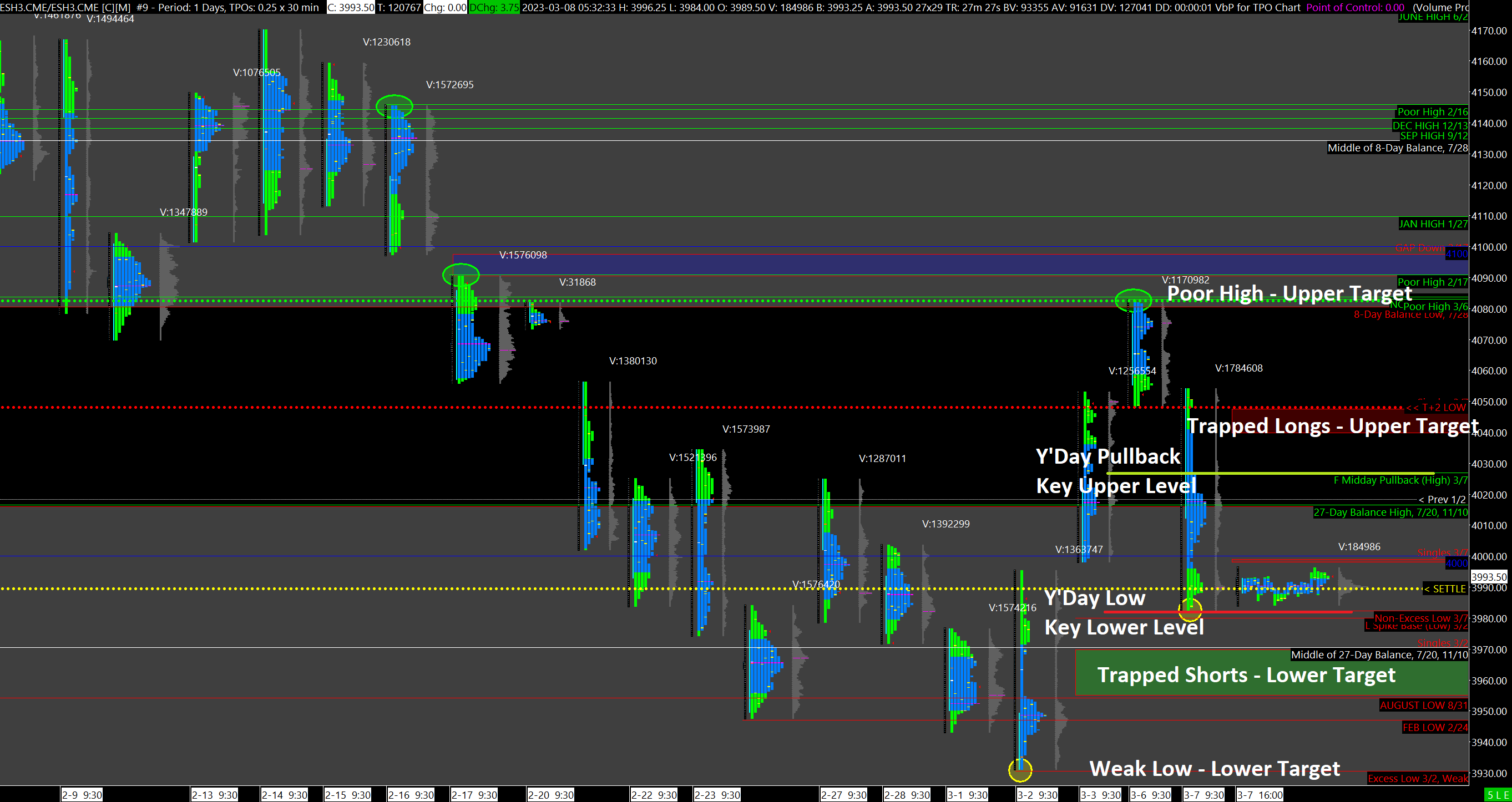 Bearish: the market breaks down below yesterday’s Low (3982), which lacks Material Excess. In this scenario, the Trapped Short Position and Weak Low from 3/2 become the obvious targets