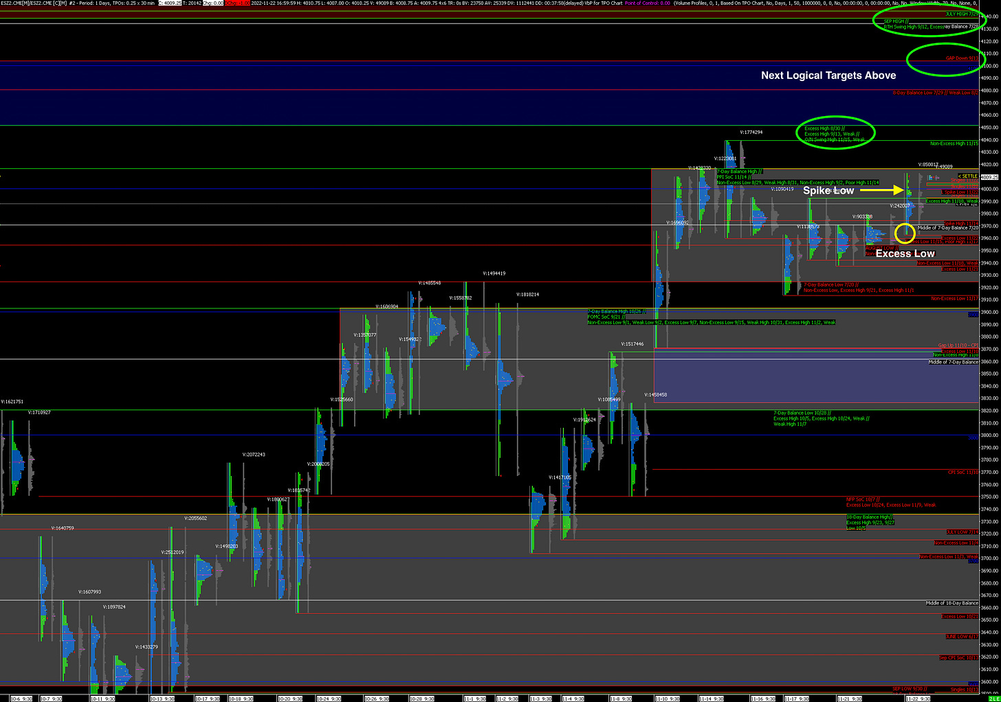 The first key for the Bullish idea tomorrow is to accept above today’s Spike Low just below 4000. Beyond that, ES futures look set to try and breakout of the current Balance Zone. A breakout was attempted on 15 Nov but was rejected so the next attempt will be important.