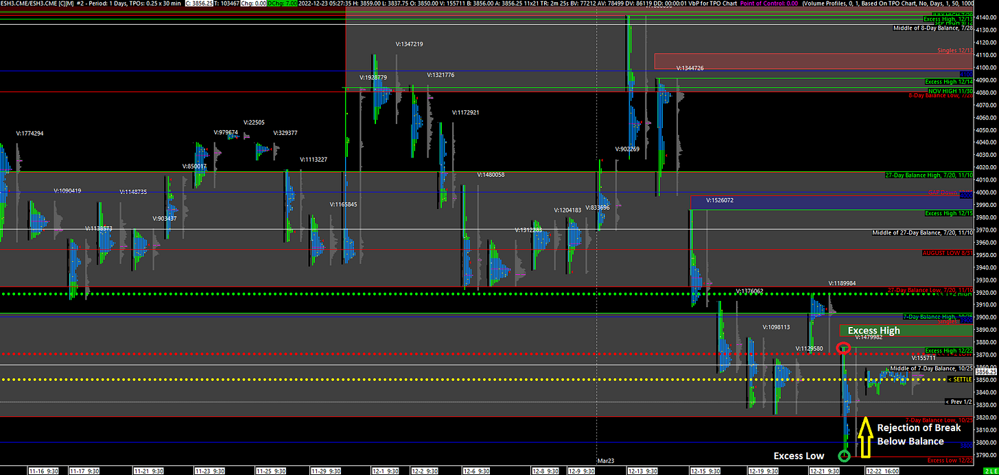 Yesterday the market reacted strongly to employment and GDP data as it sold off strongly and in an emotional fashion, leaving behind relatively Poor Structure. Importantly, yesterday left behind an Excess High and an Excess Low. The ES also rejected a break below the current Balance Zone and is now trading around its middle.