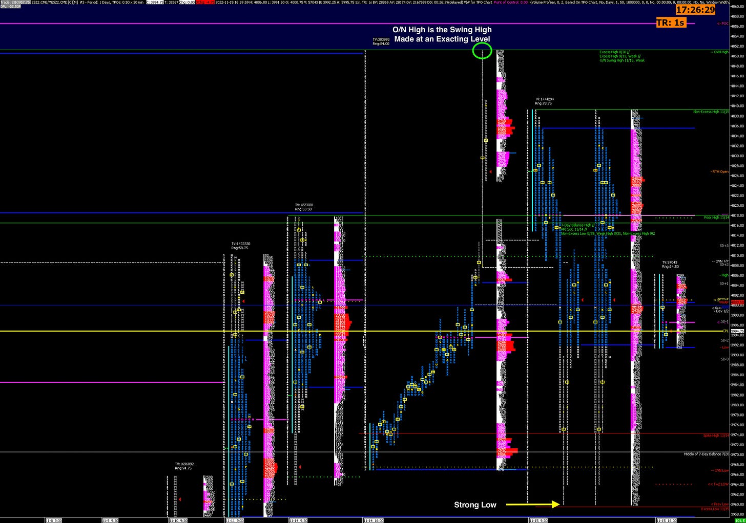 Following the PPI data release this morning, the S&P 500 rallied all the way up to the bottom of a previous Gap down to the tick before selling off. In addition to the exacting level where today’s selloff started, the current swing high is now made in the overnight session. These typically don’t last long - we had a similar situation happen recently where the prevailing swing high was also in the overnight.