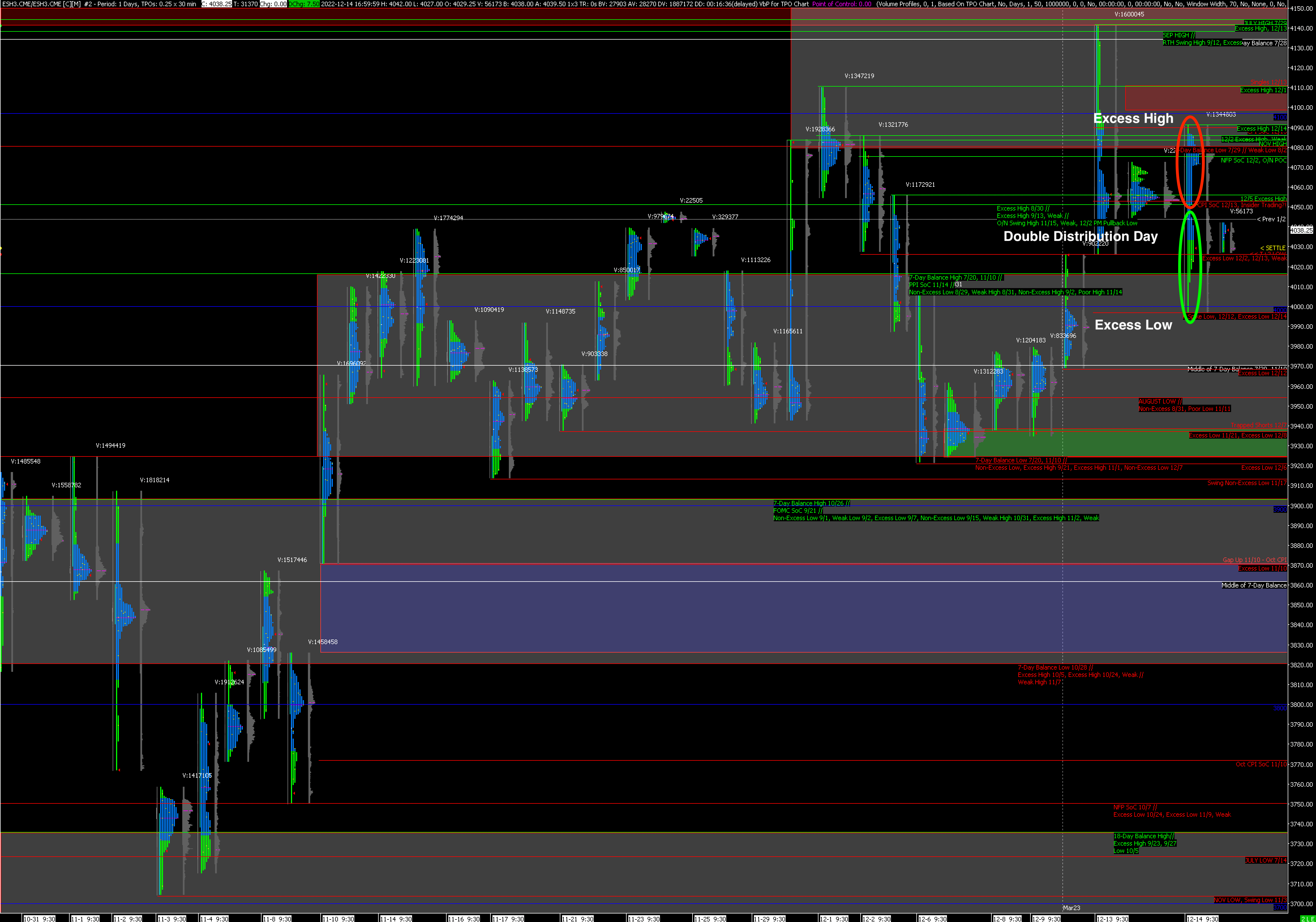 Today the ES put in an Excess High and an Excess Low on either side of what turned out to be a Double Distribution day. In the process, the market has repaired all the poor structure below put in during the CPI rally earlier this week.