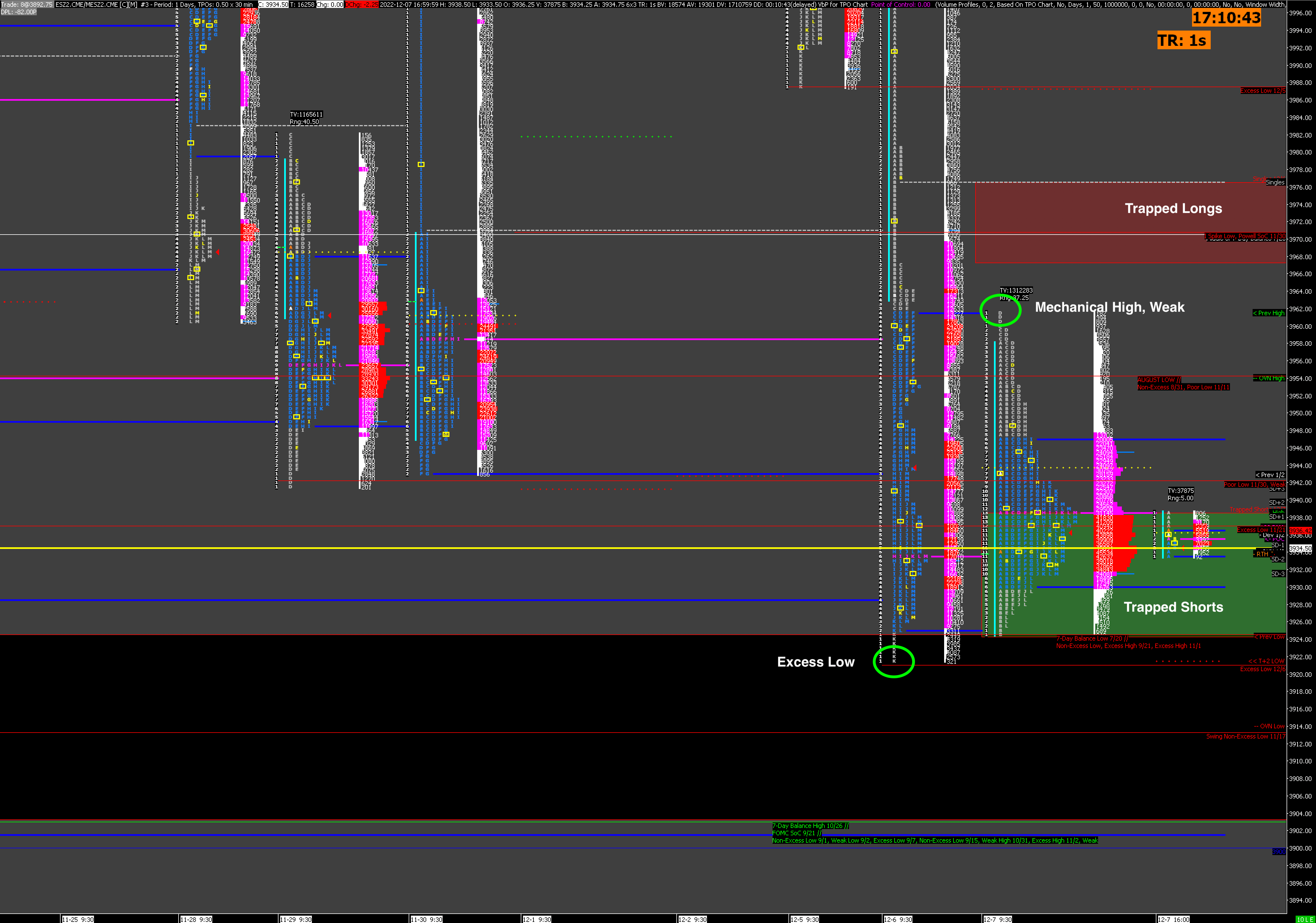 Today’s SPX Futures trading was dominated by mechanical trading within a relatively tight range. The day’s High is mechanical as it coincides with yesterday’s Value Area High (VAH) to the tick. The Low coincides with the bottom of the current Balance Zone and both barely have Excess. A nuance present today is that there are now plenty of Trapped of Short positions below today’s Point of Control (POC) to go along with the Trapped Long positions above.