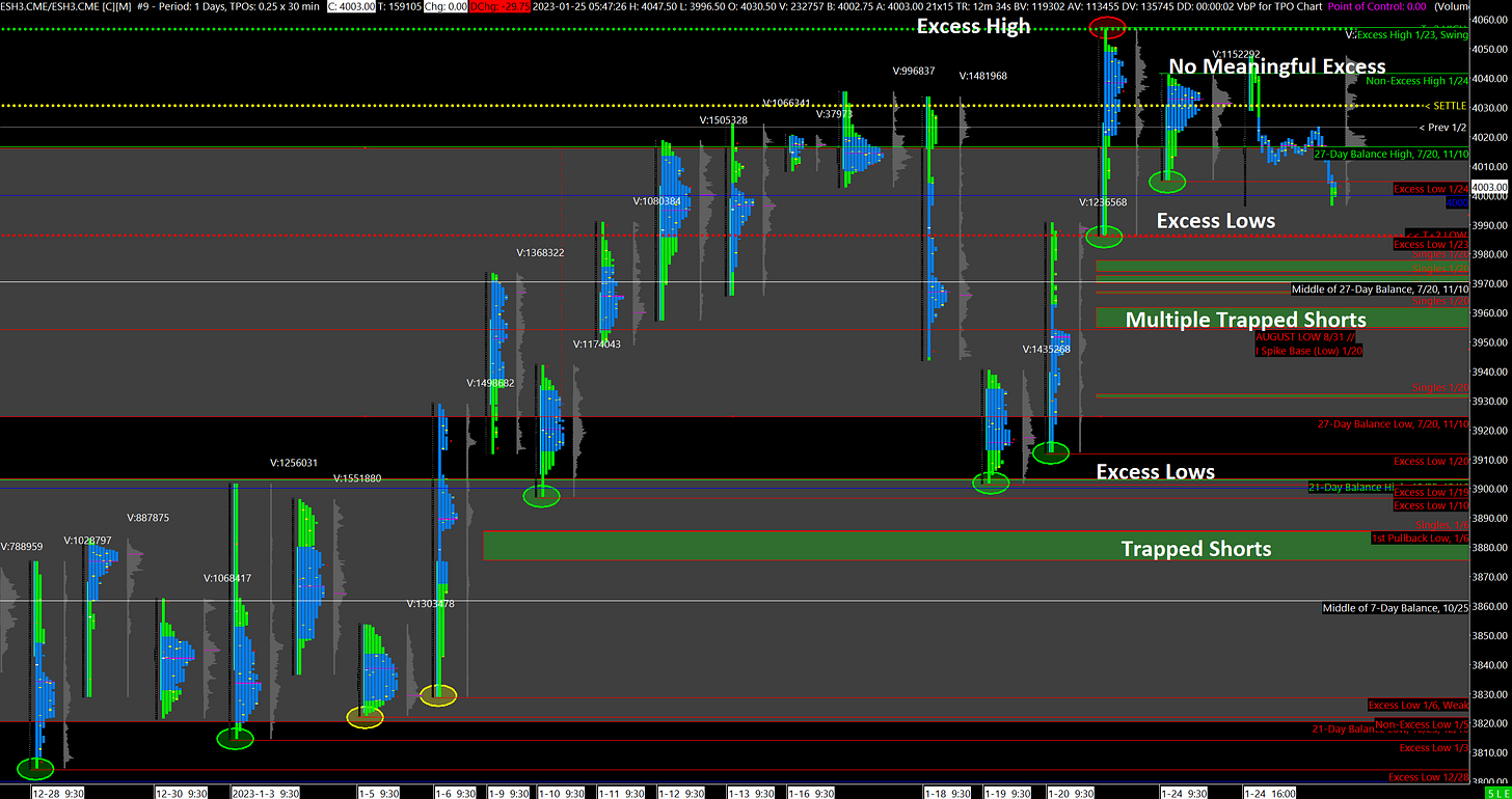 The fact that the ES did not even come close to the Monday (1/23) High and the proximity of the Previous Balance Zone below contributes to this idea. At this point, if you are Long-biased, don’t be over-eager - let the market show its hand first. If you are Short-biased, be careful in overstaying your welcome.